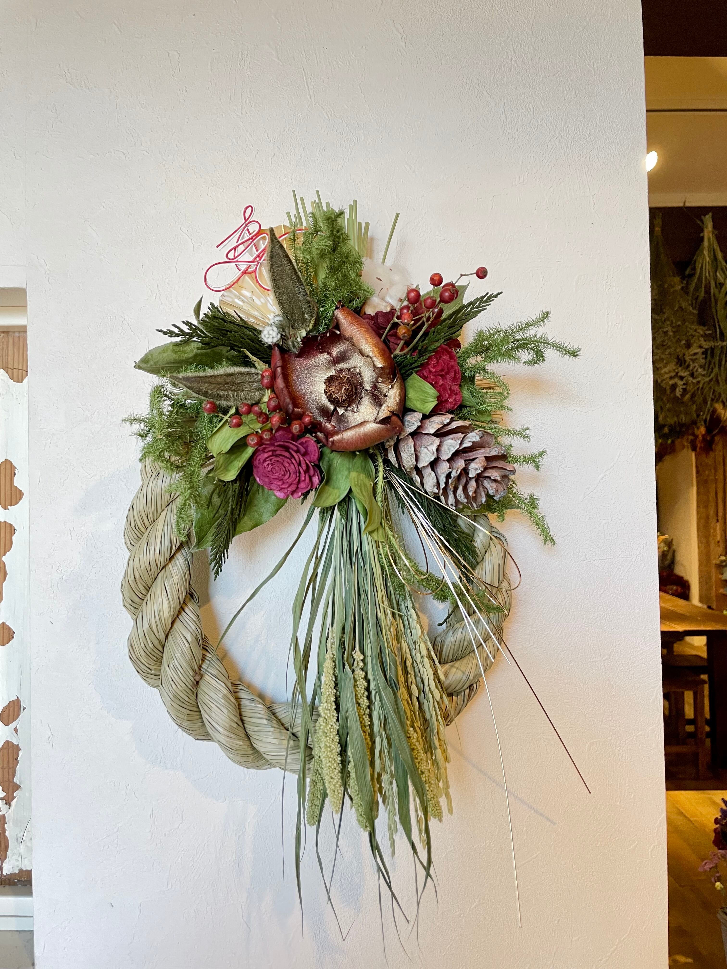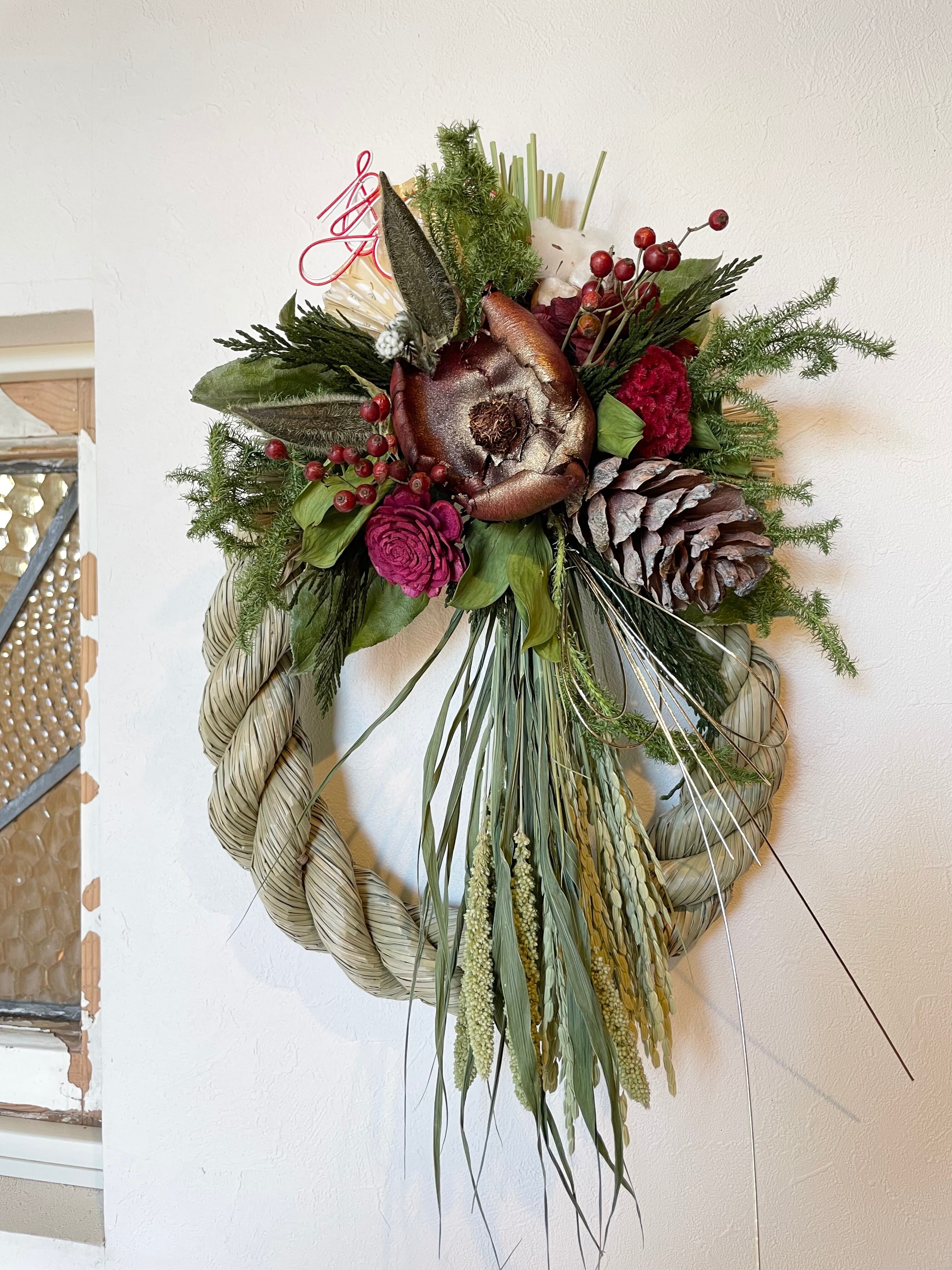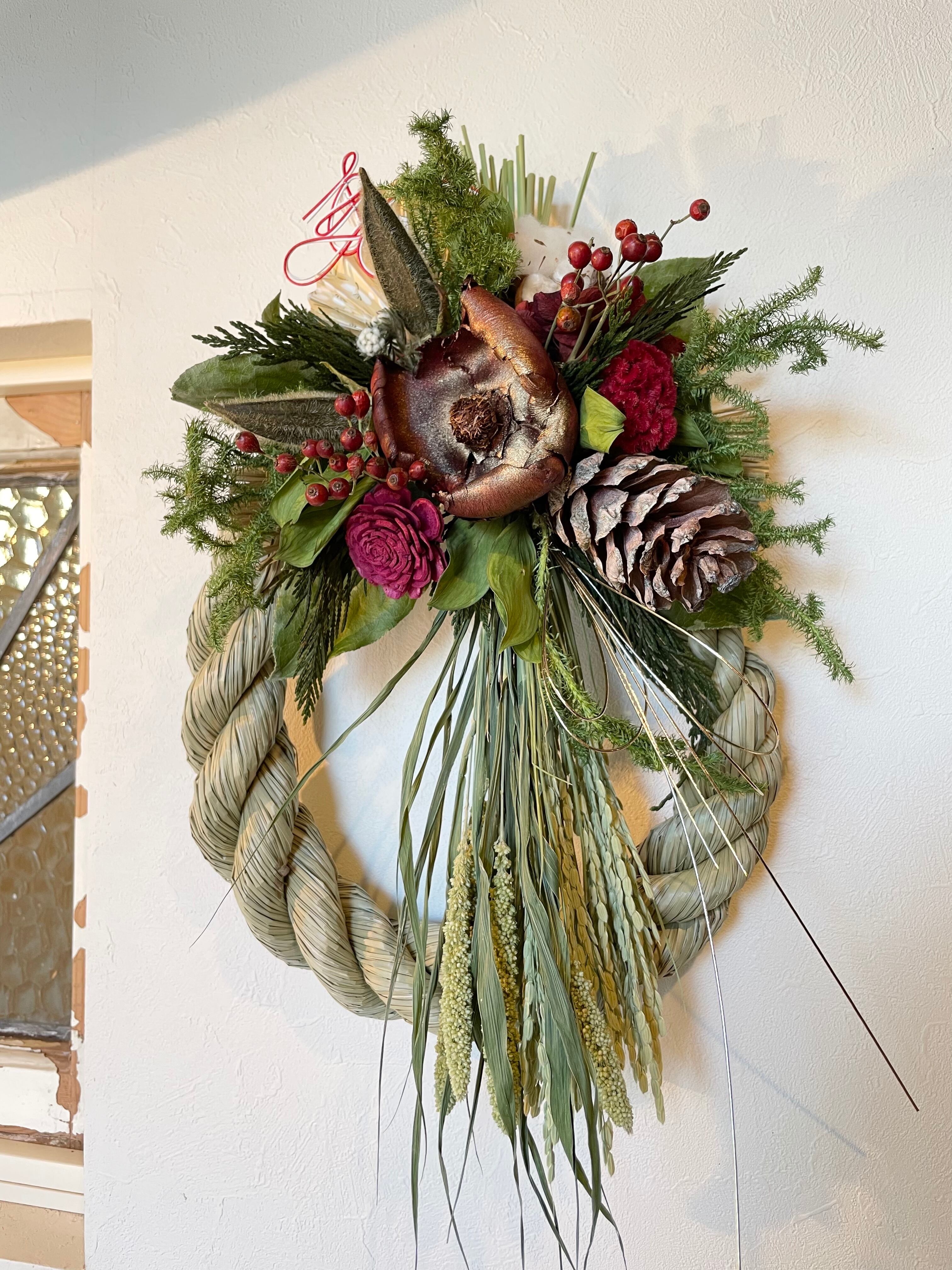 メインのボルドーのパームフラワーを中心に、コットンやケイトウなど冬色の花材をたっぷり使ったしめ飾り。縦に伸びる稲がシックな雰囲気のしめ飾りです。