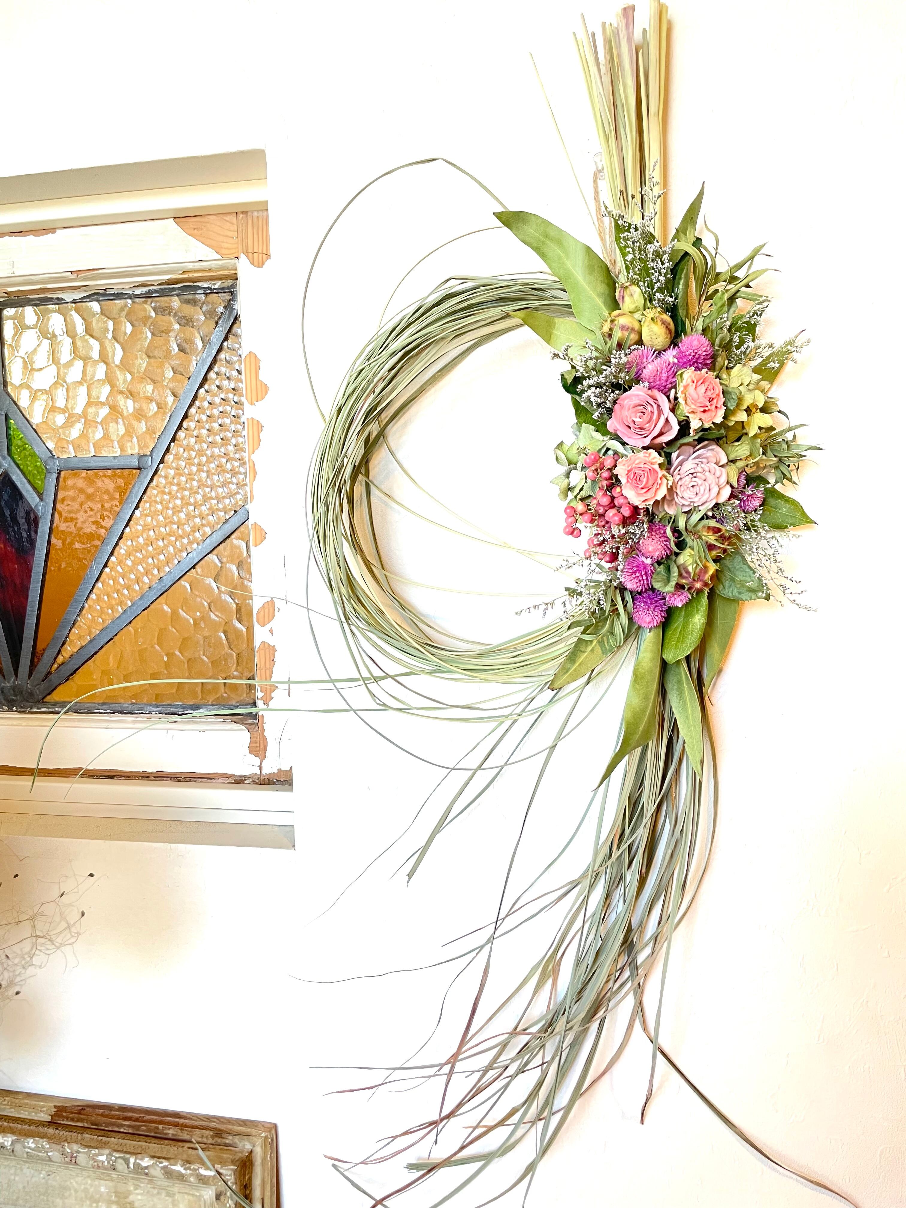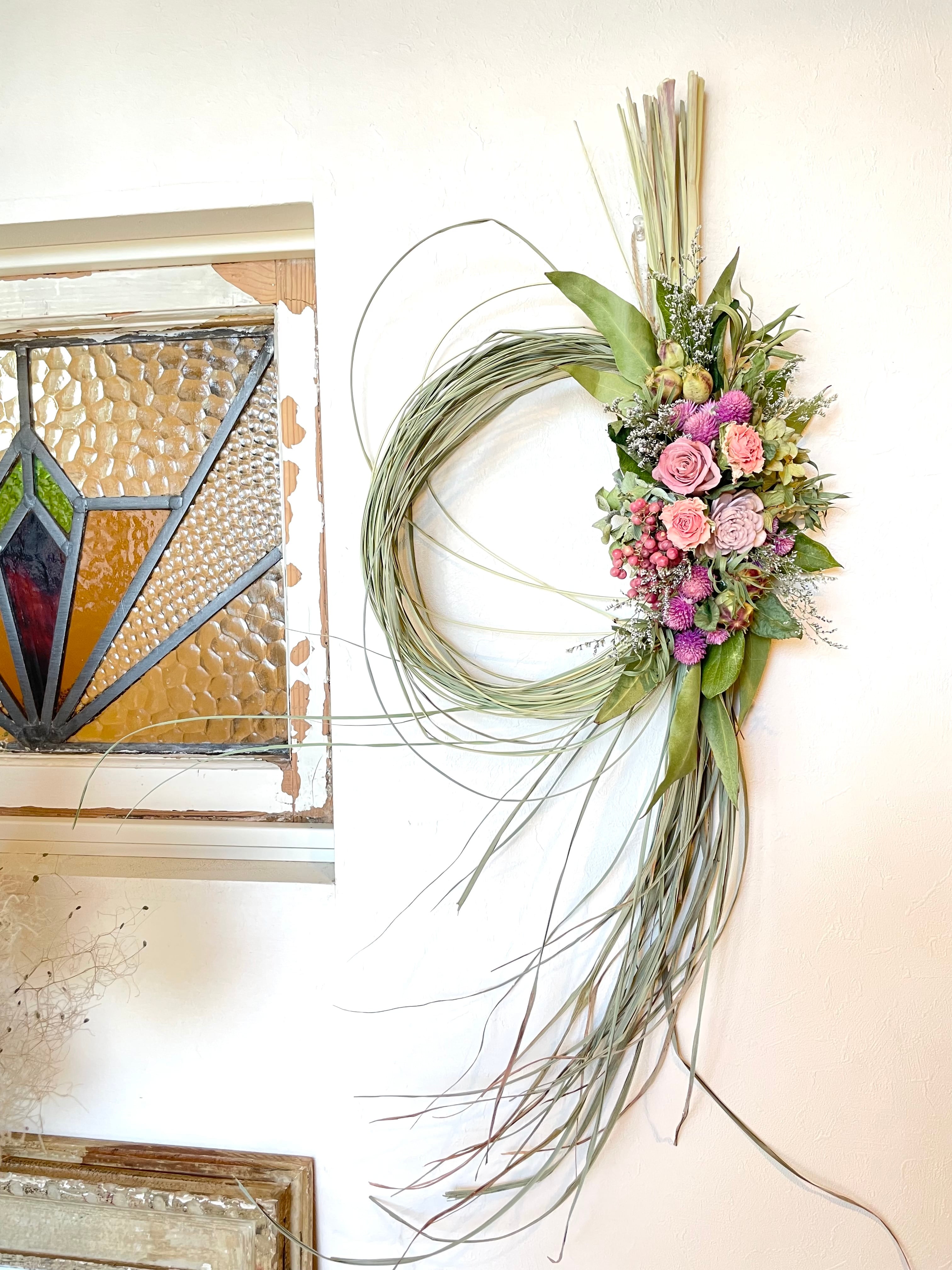香りも色も楽しめる、ドライフラワーならではのリース。