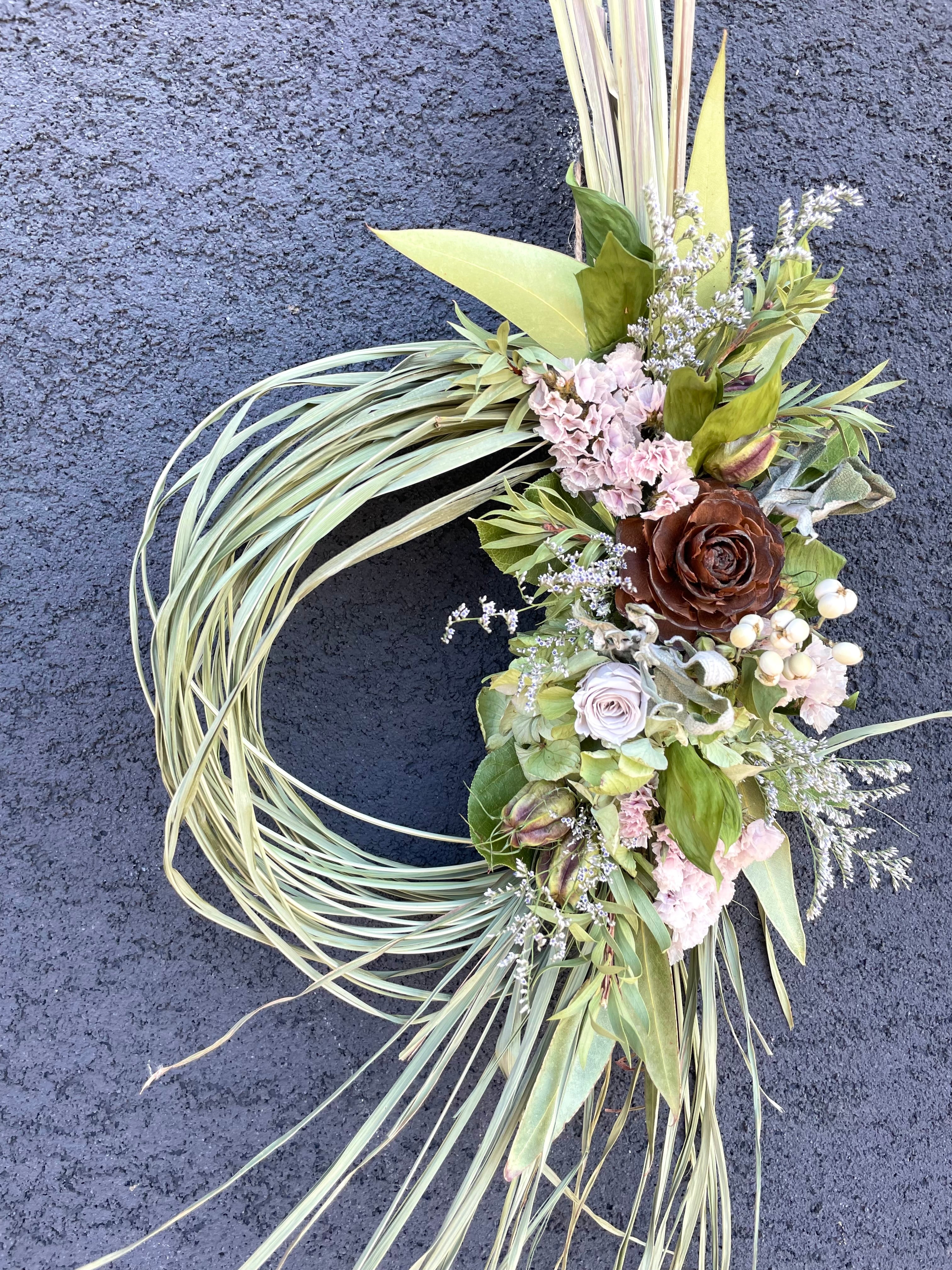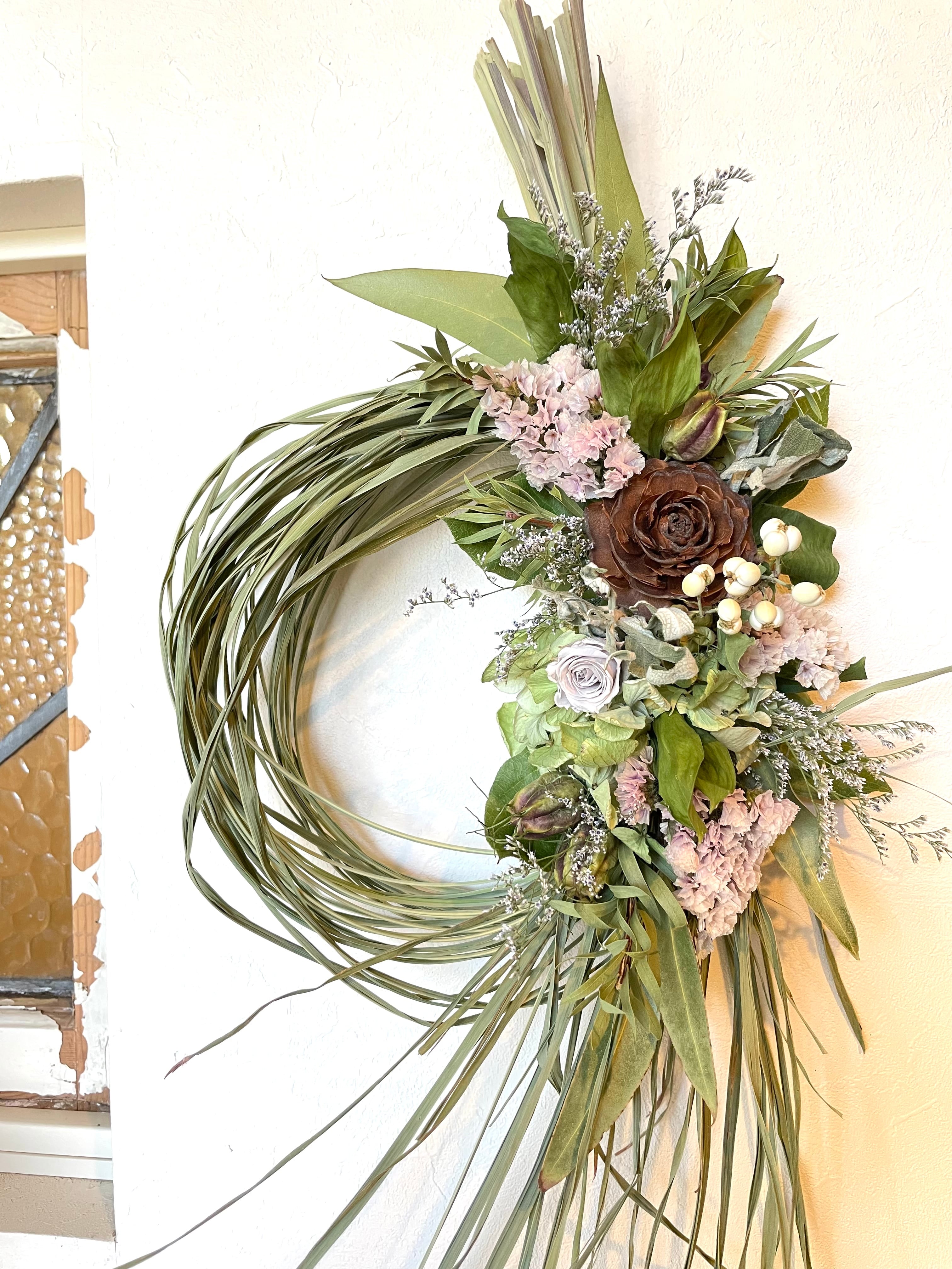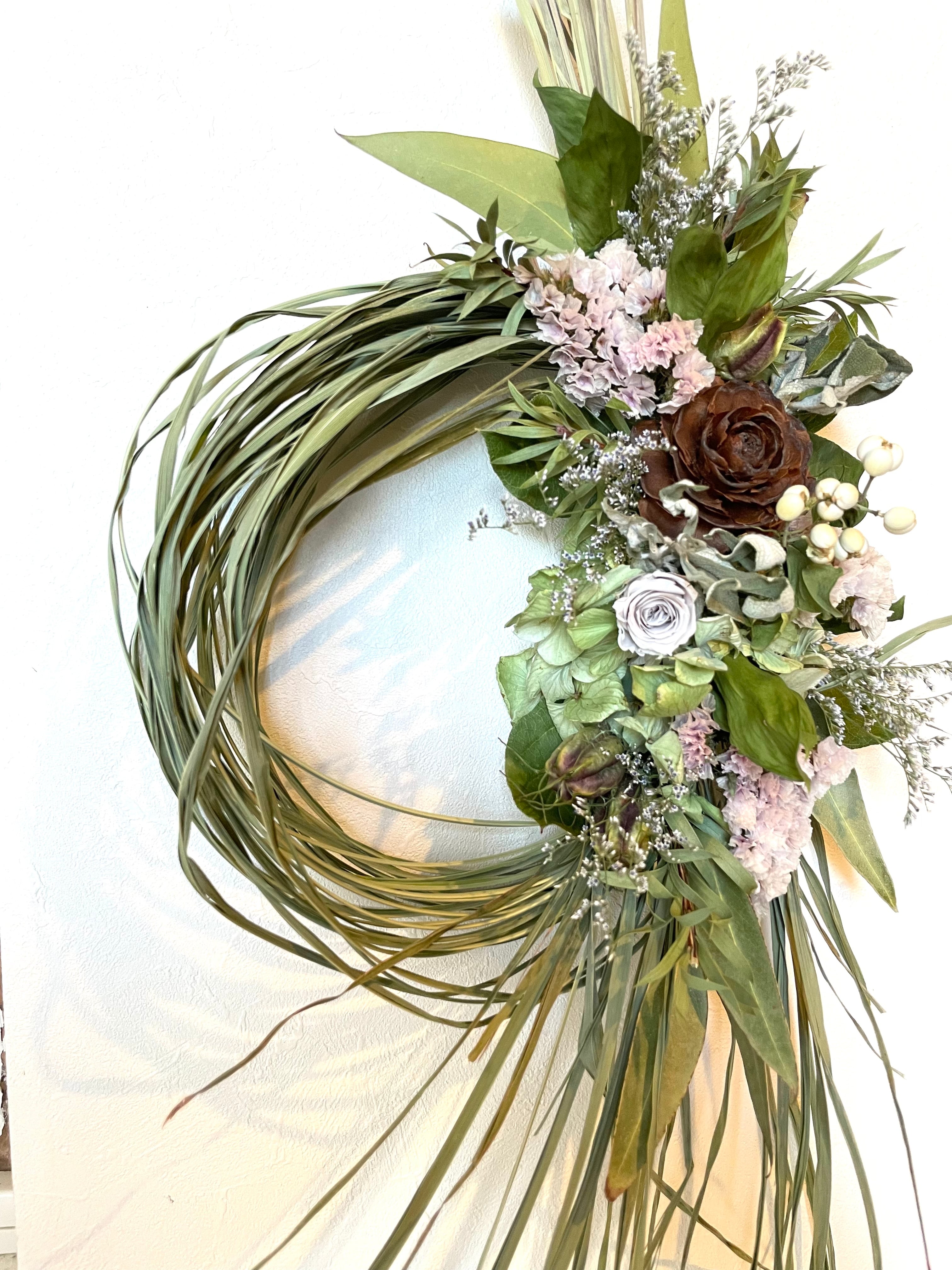 香りも色も楽しめる、ドライフラワーならではのリース。