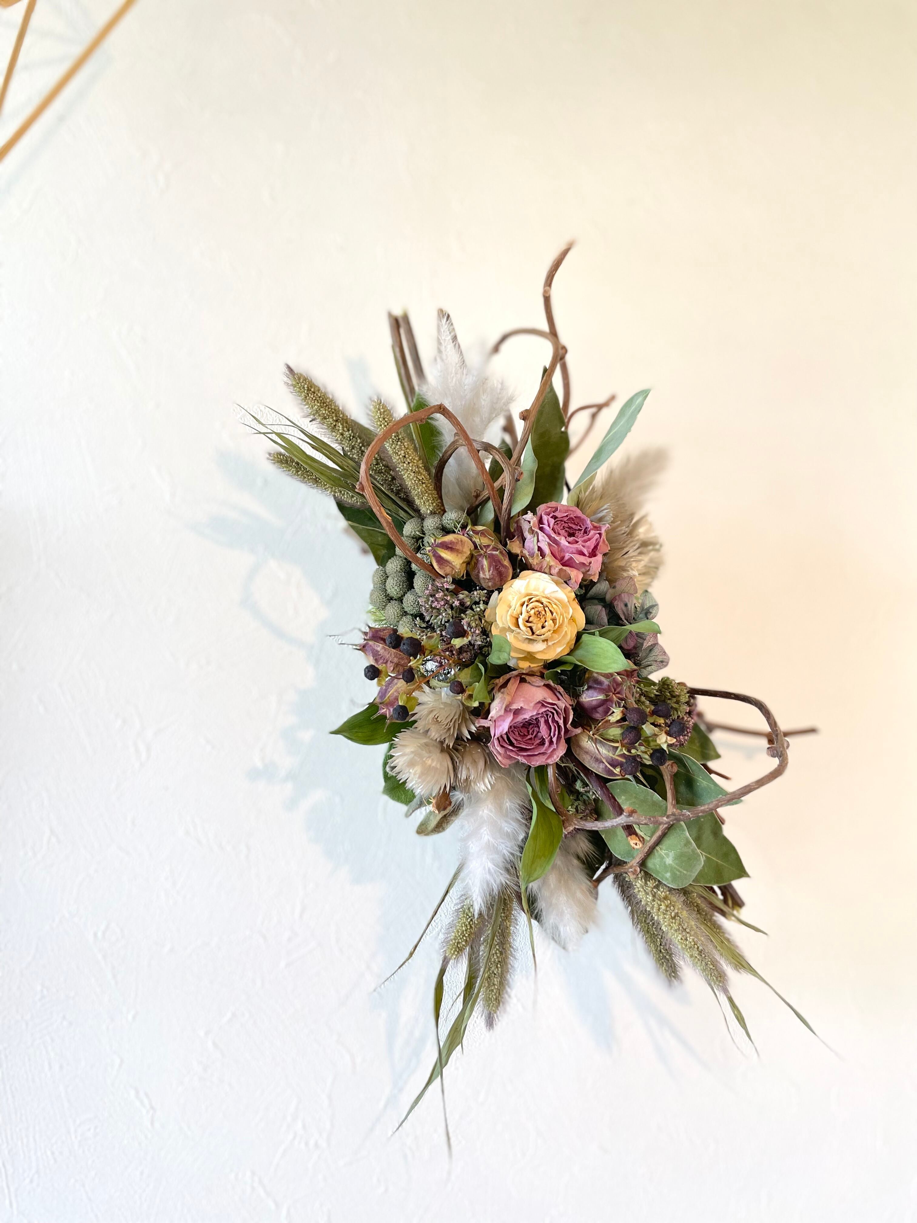 アジサイのパープルやオレガノなど、紫系を合わせてシックな色合いに。