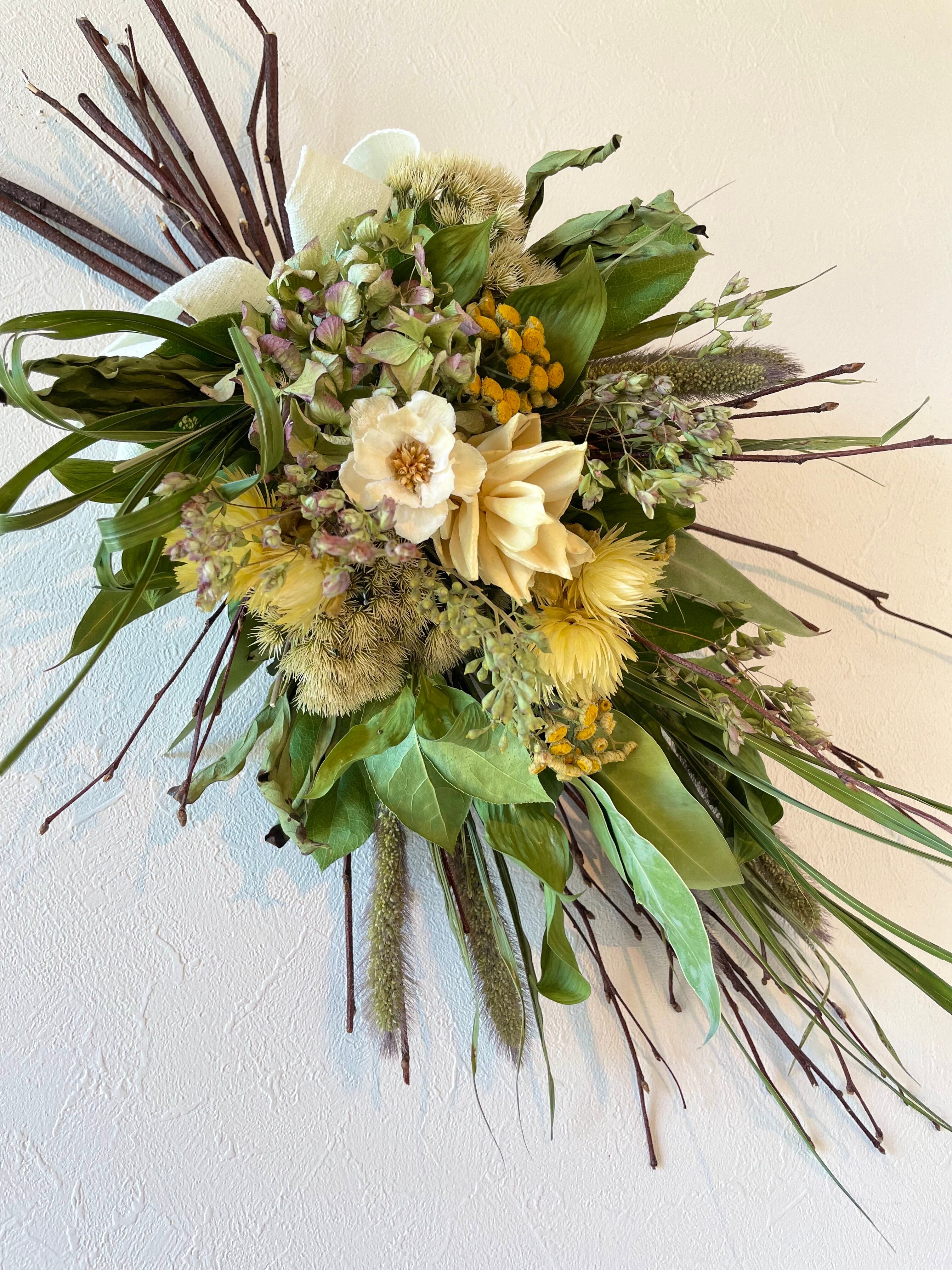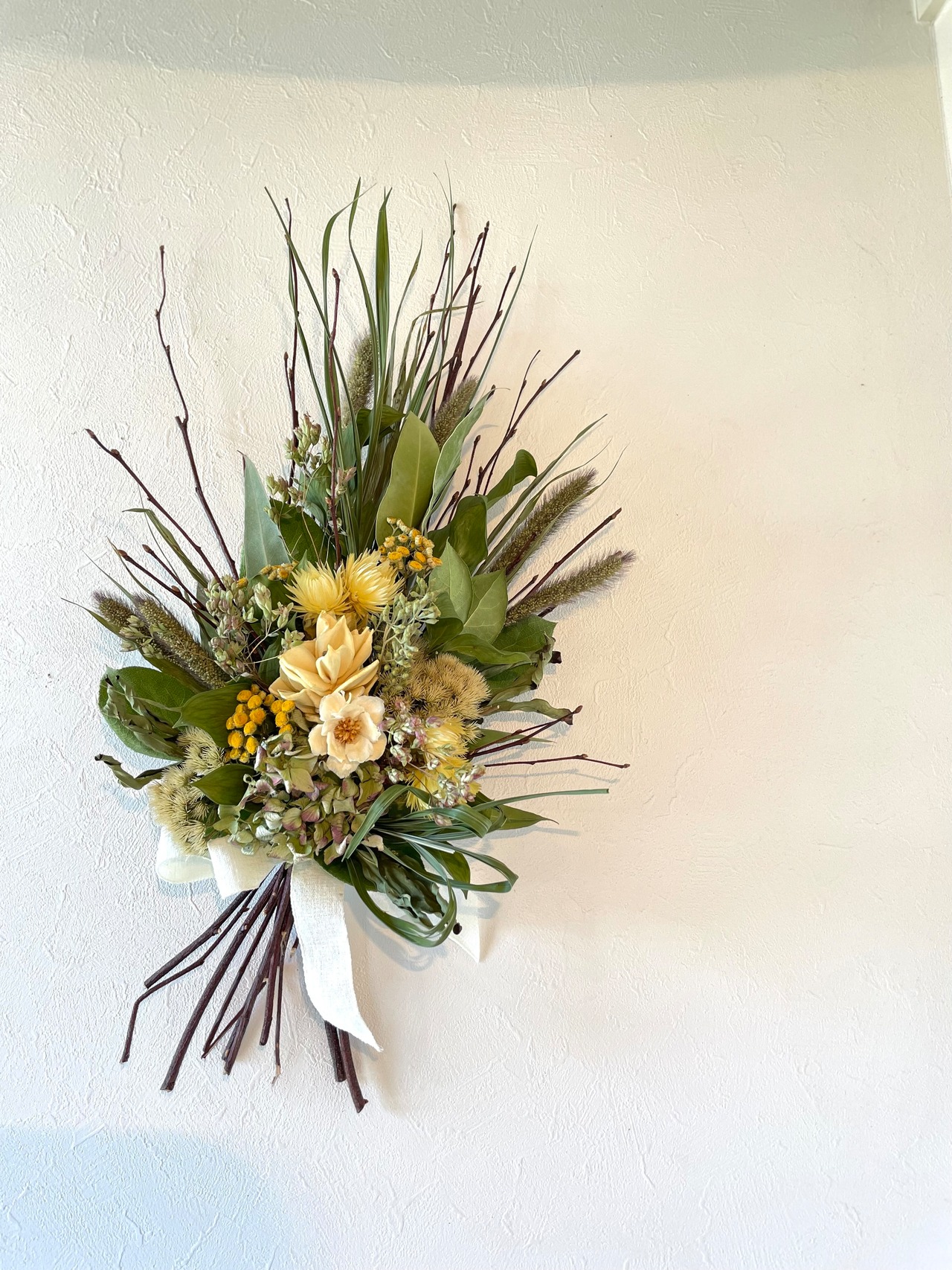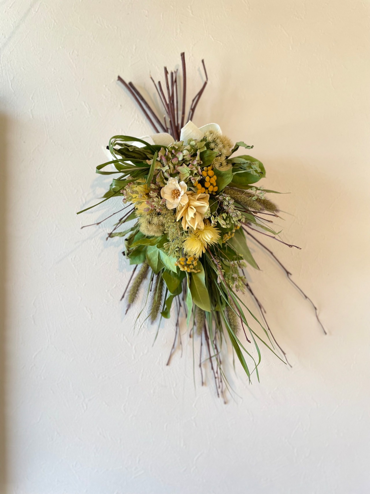 白樺の枝をベースに、スワッグブーケ風にアレンジした壁掛けアレンジ。