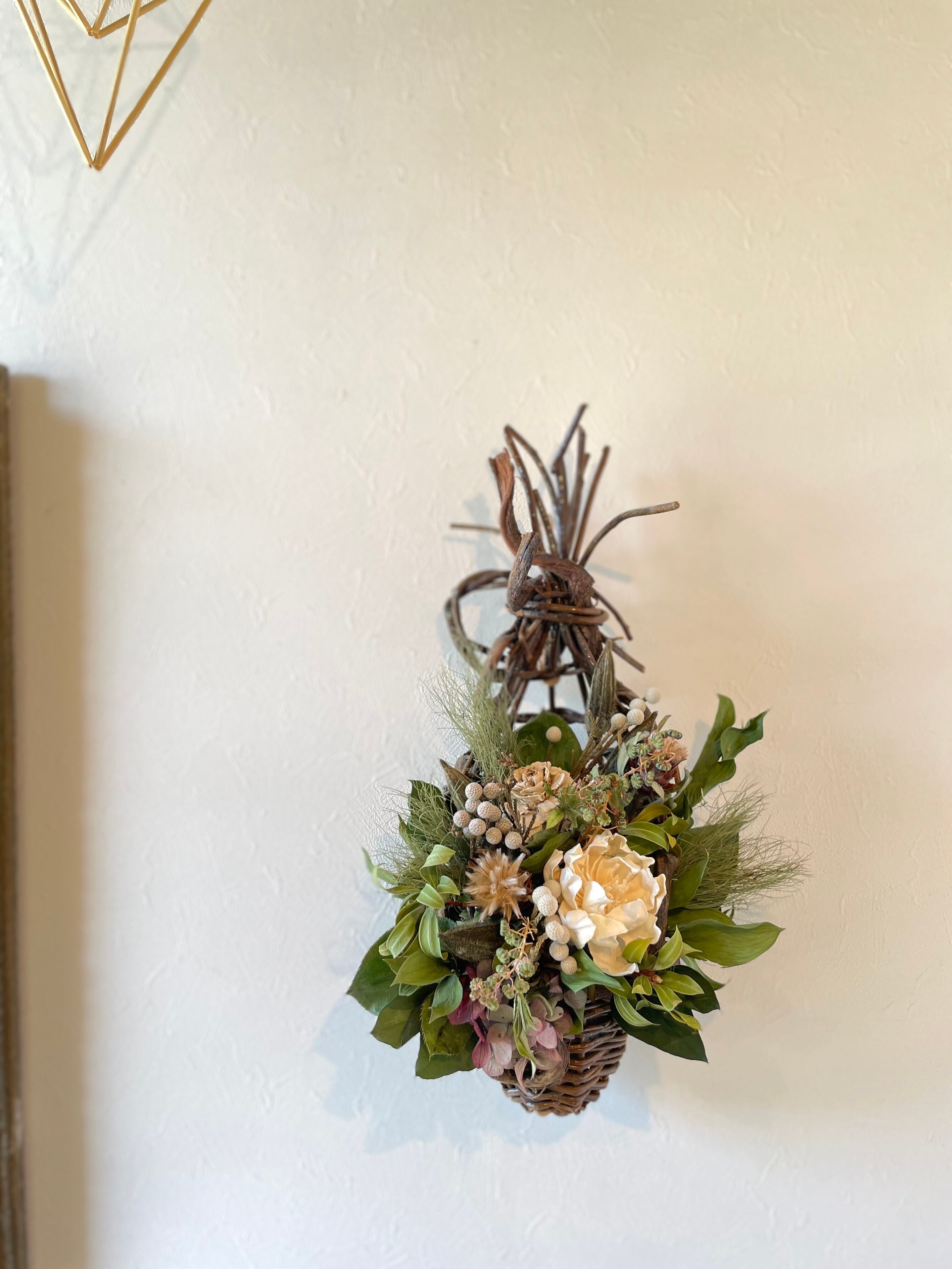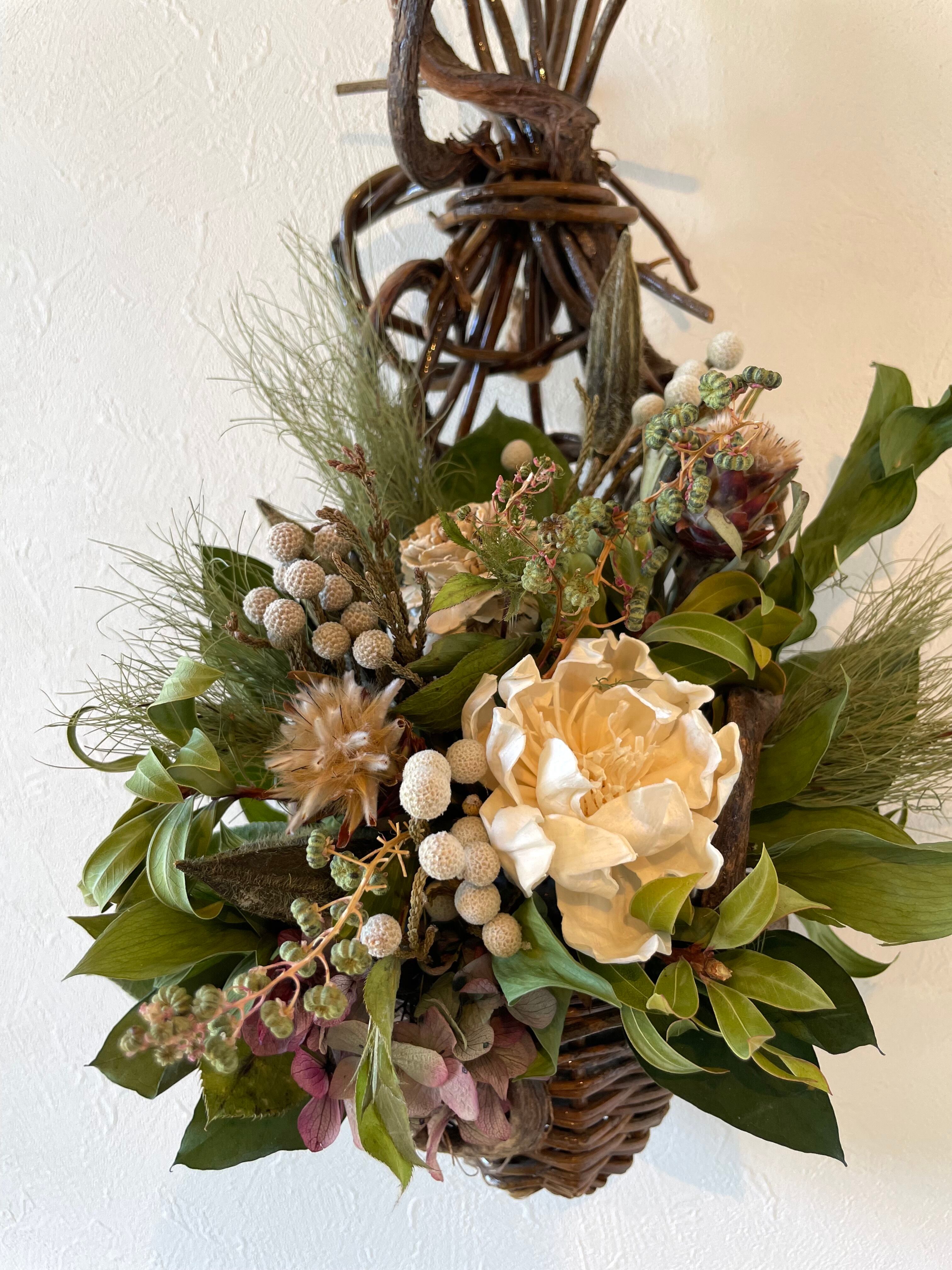 和にも洋にも飾れる雰囲気のバスケットアレンジ。