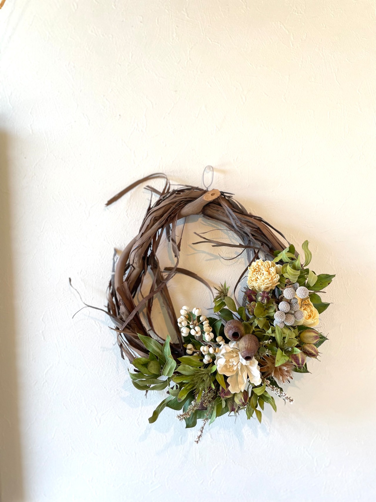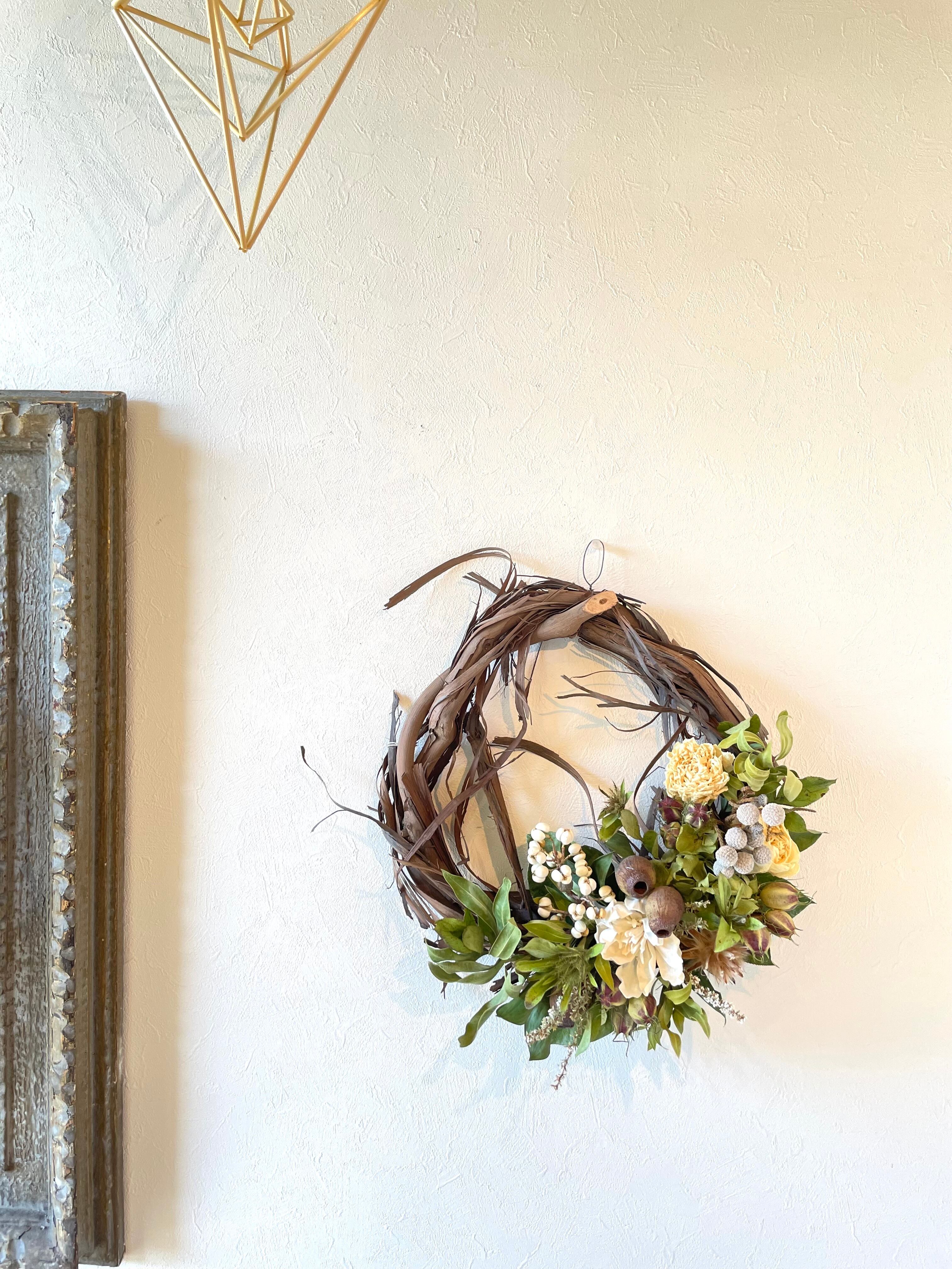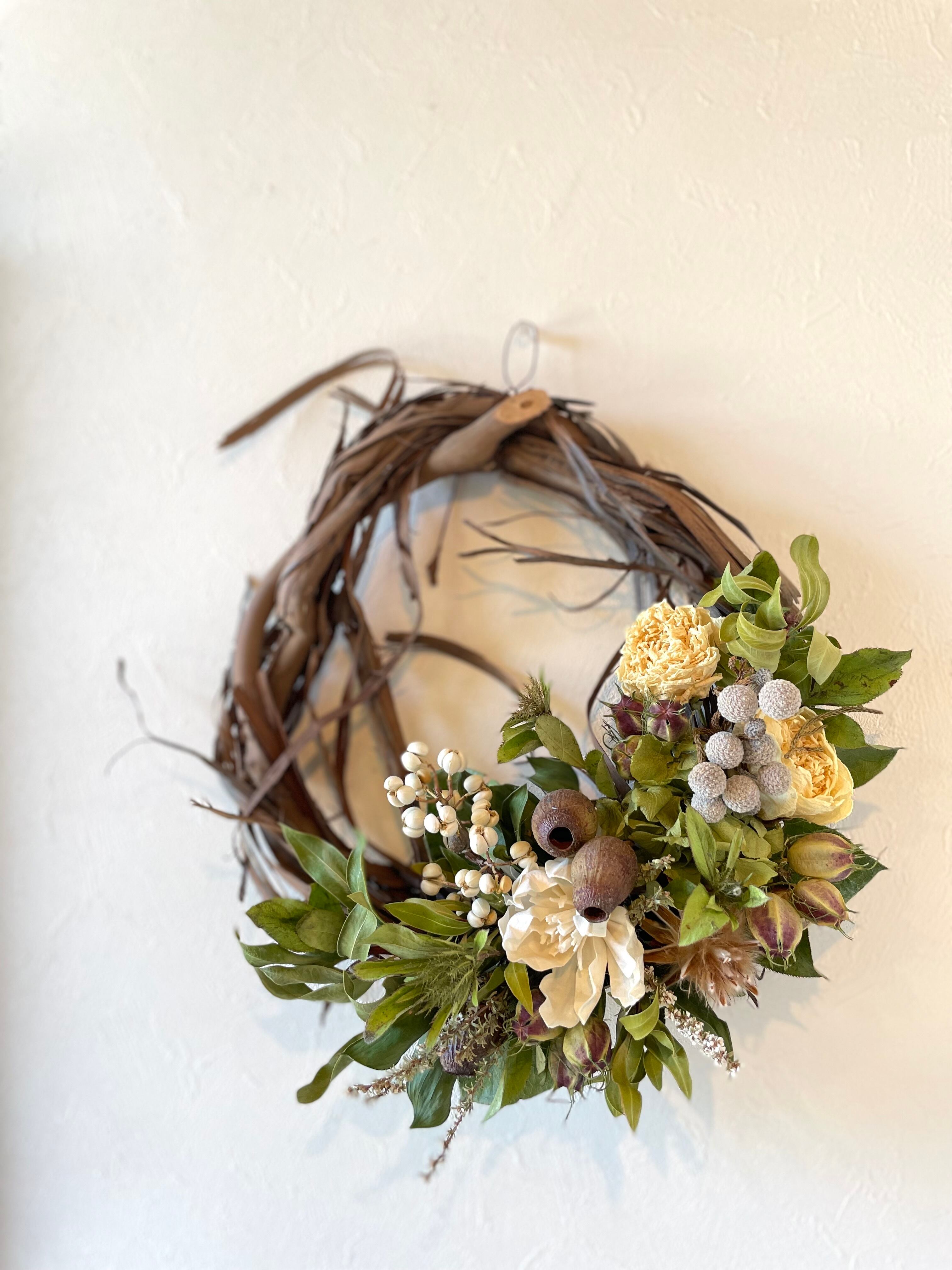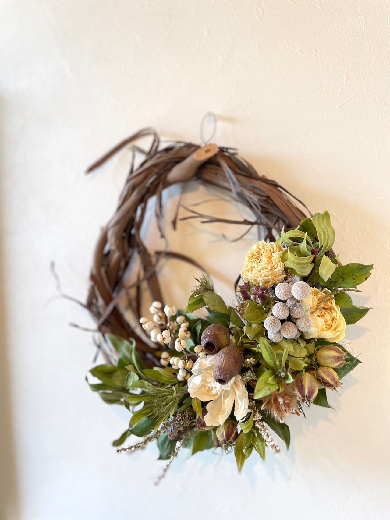 ブドウヅルをナチュラルに丸めたリースベースにシックな色合わせで。