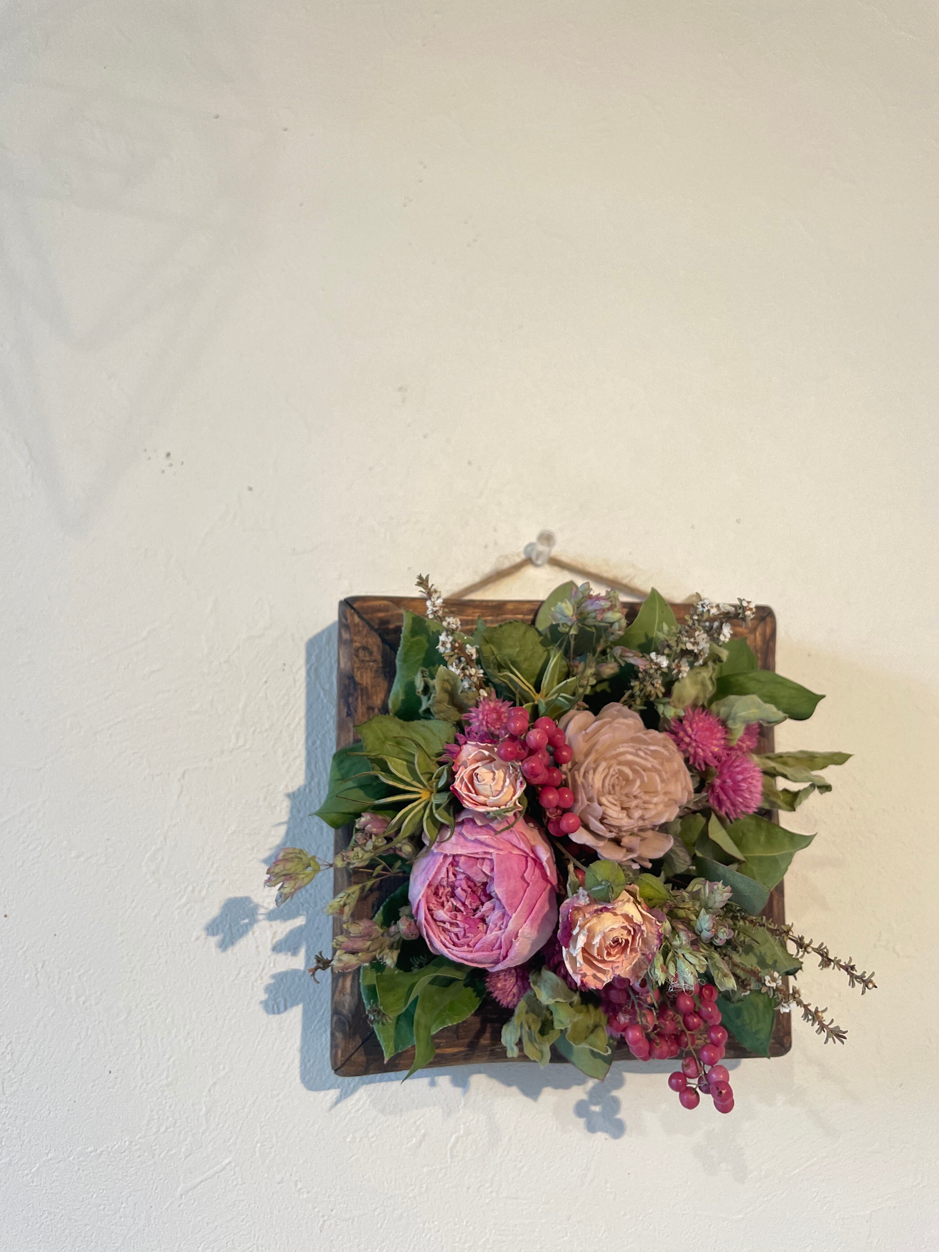 1点1点手作りのウッドフレームに、ドライフラワーをたっぷりとアレンジしたギフトに最適のアレンジ。
