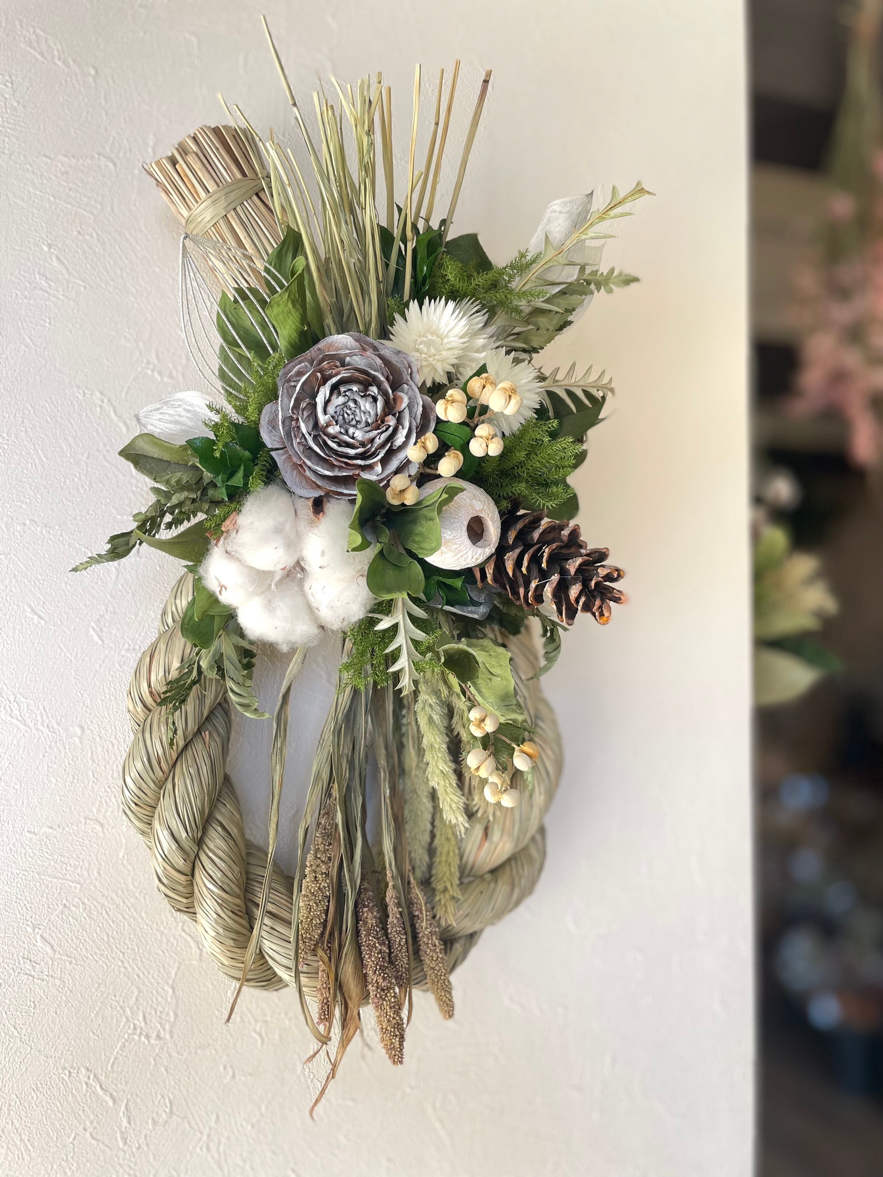白をメインにしたシンプルなしめ飾り。大きなコットンフラワーがなんとも可愛らしく、冬の間ずっと飾っておけるような花合わせも特徴です。