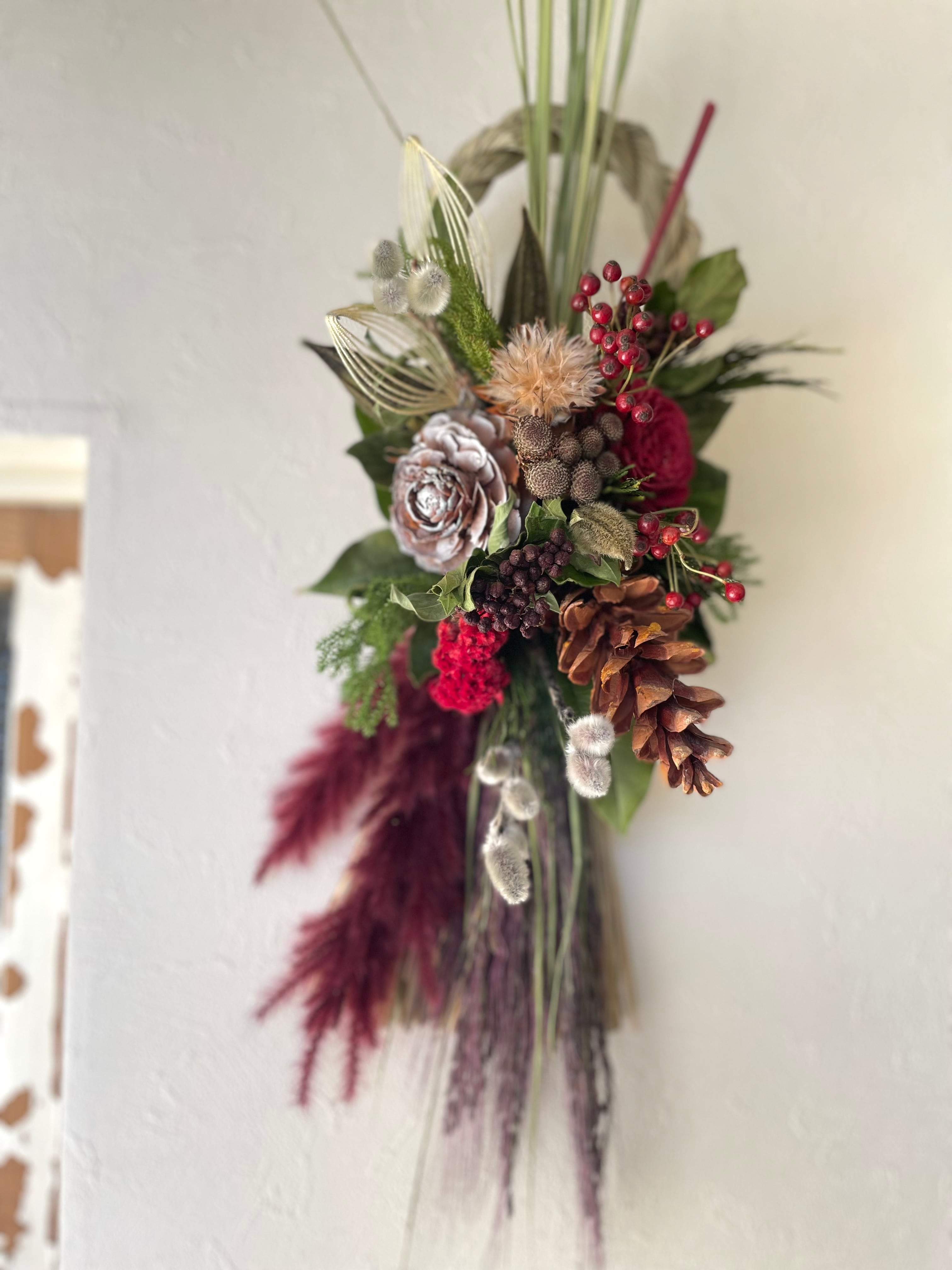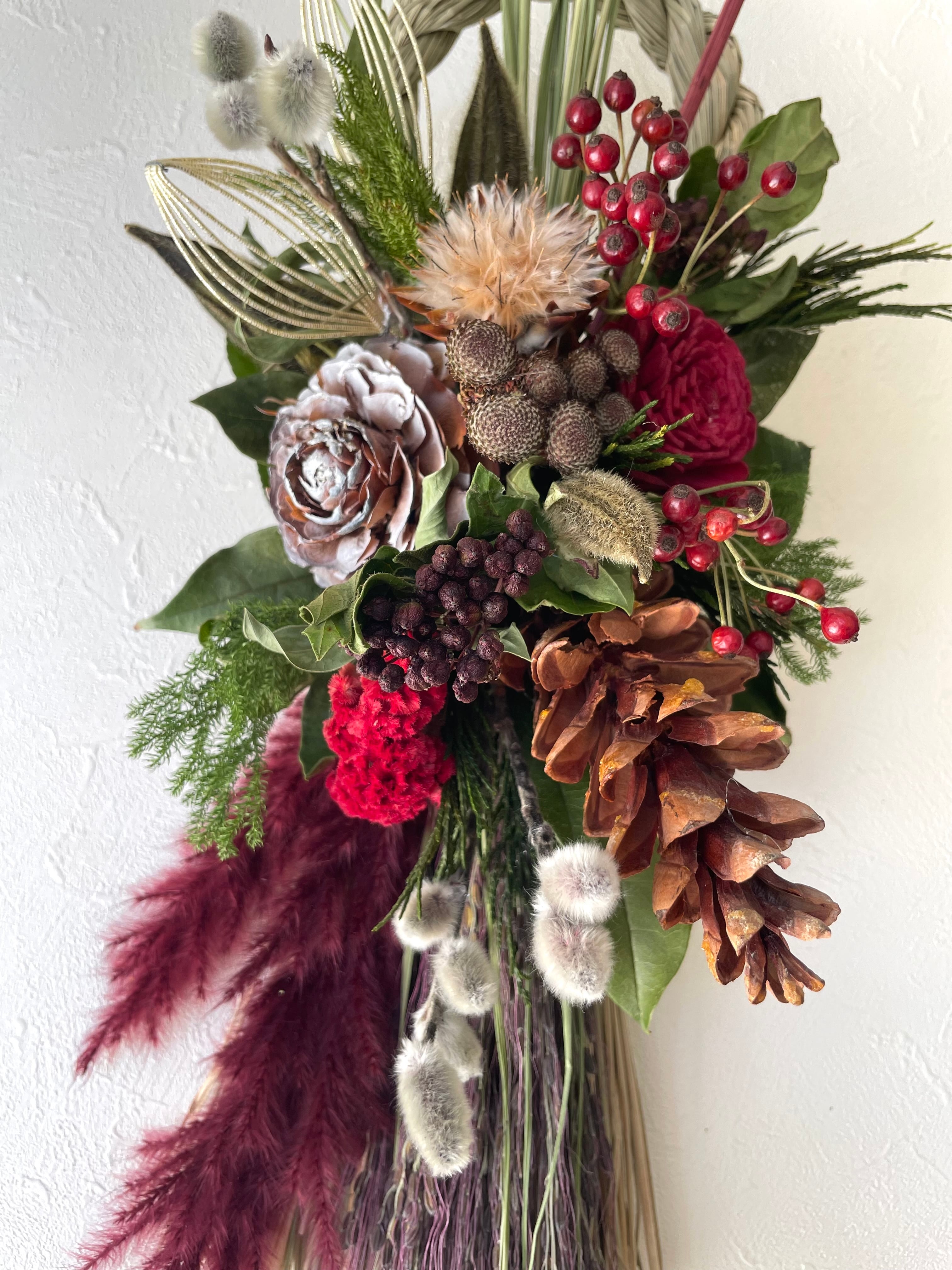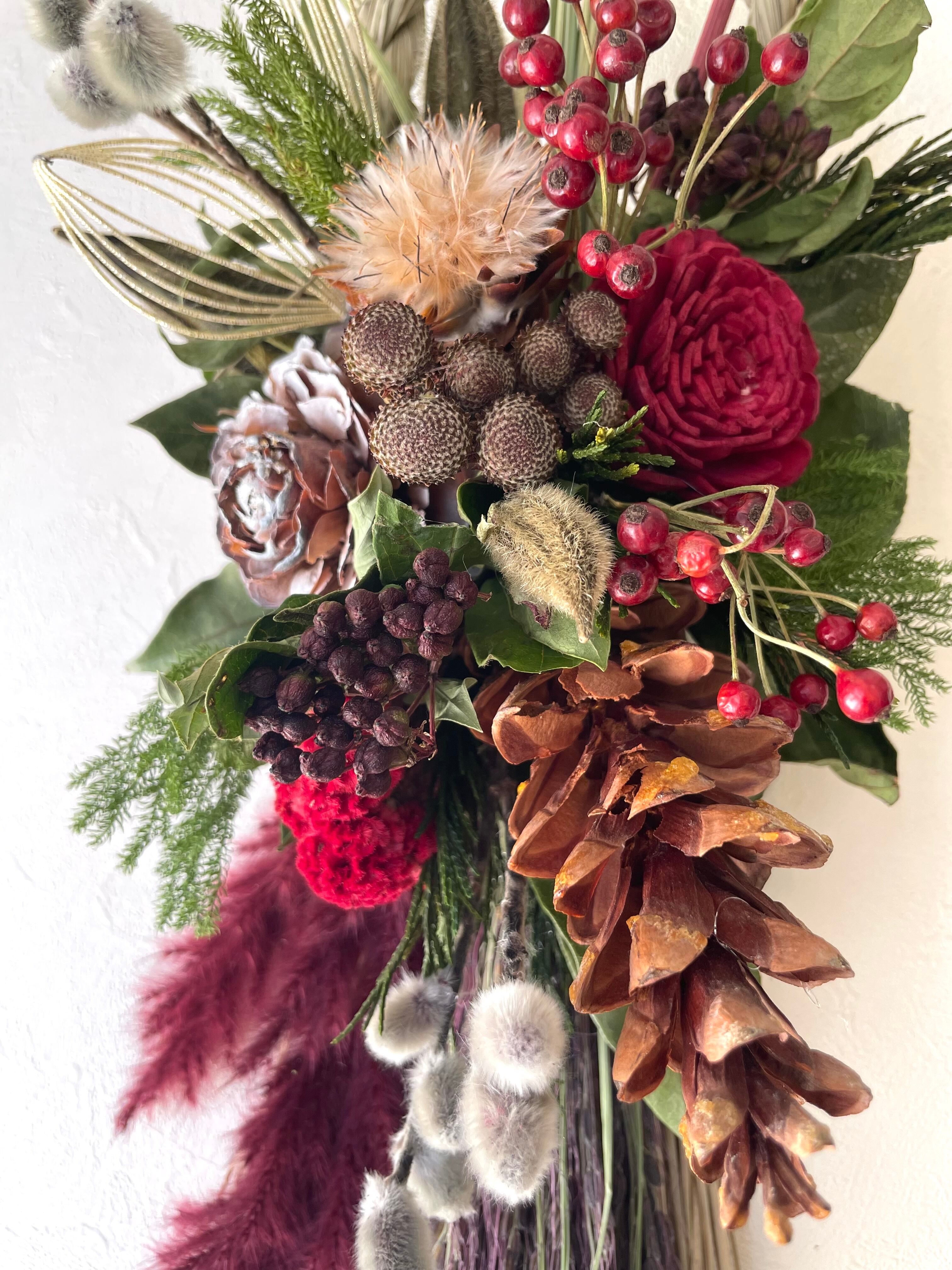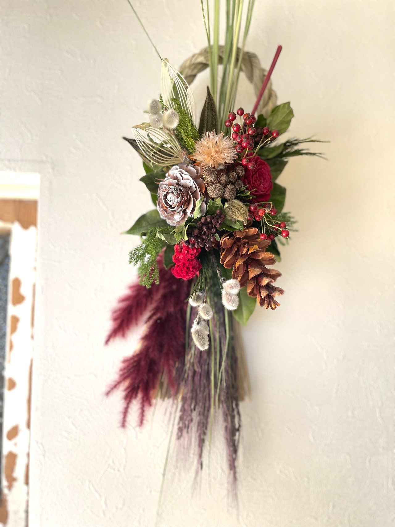 古代稲とテールリードのボルドーカラーが素敵なしめ飾り。