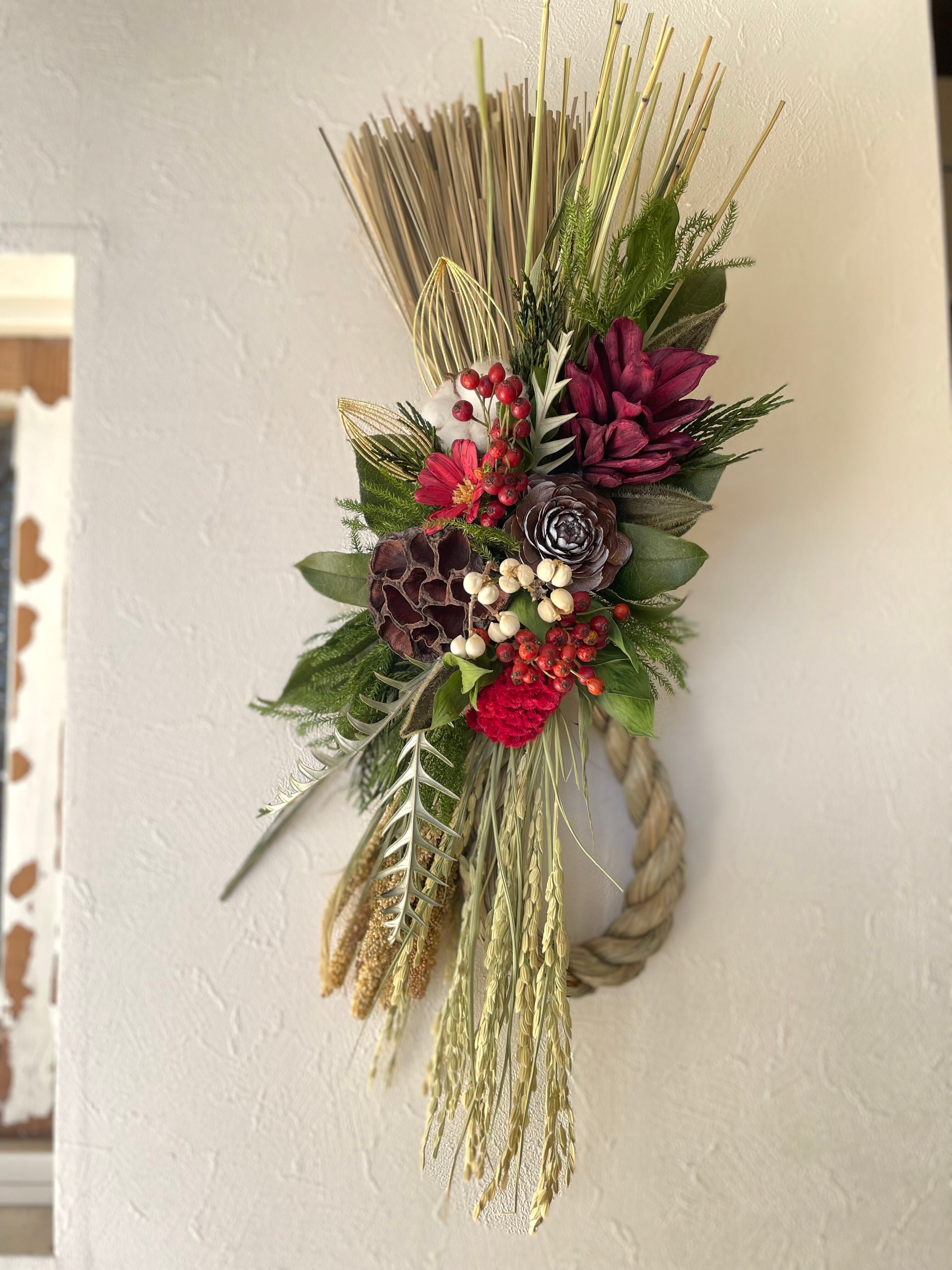 ソーラープロテアのボルドーとハスをメインに仕上げたしめ飾り。