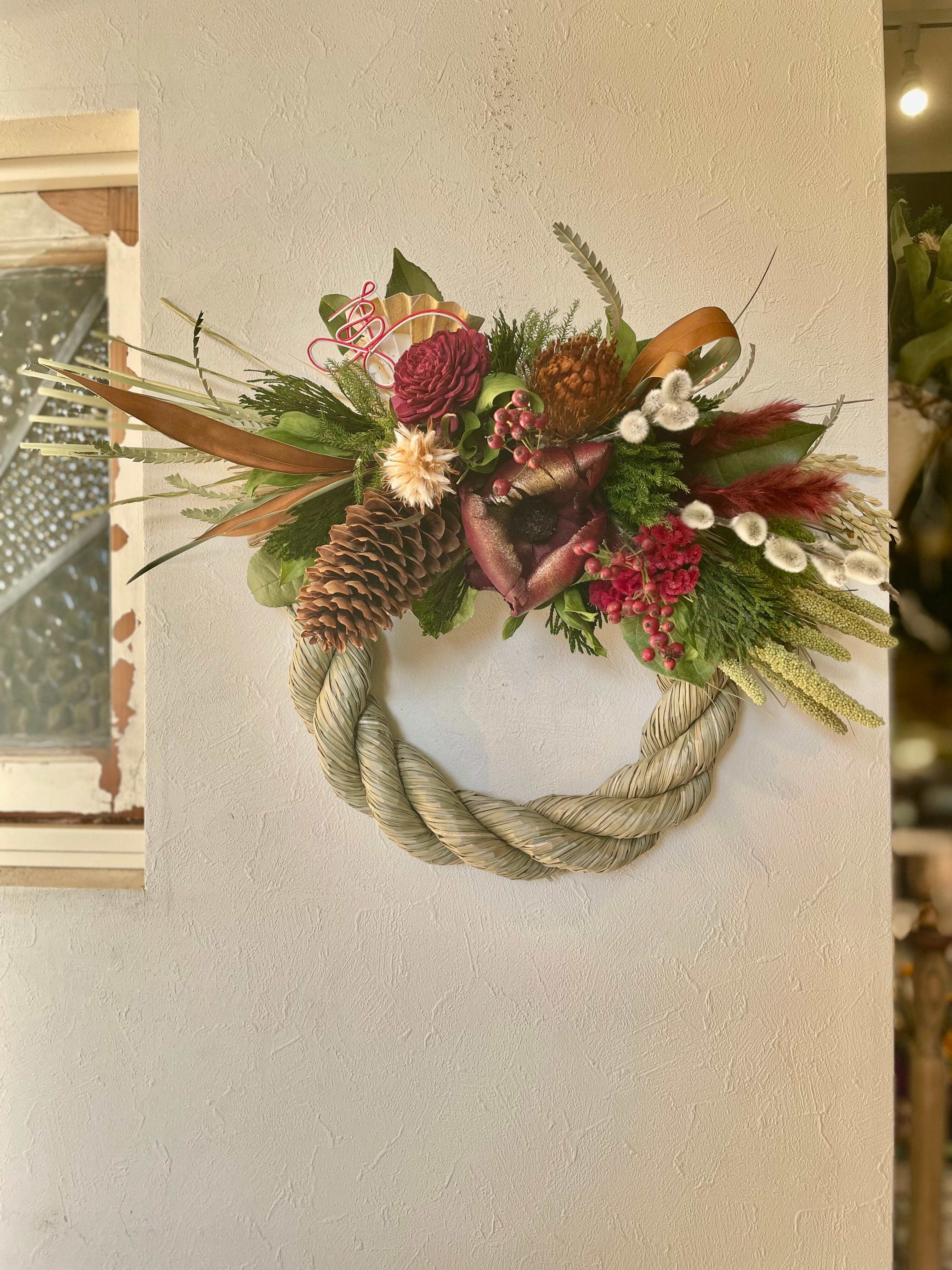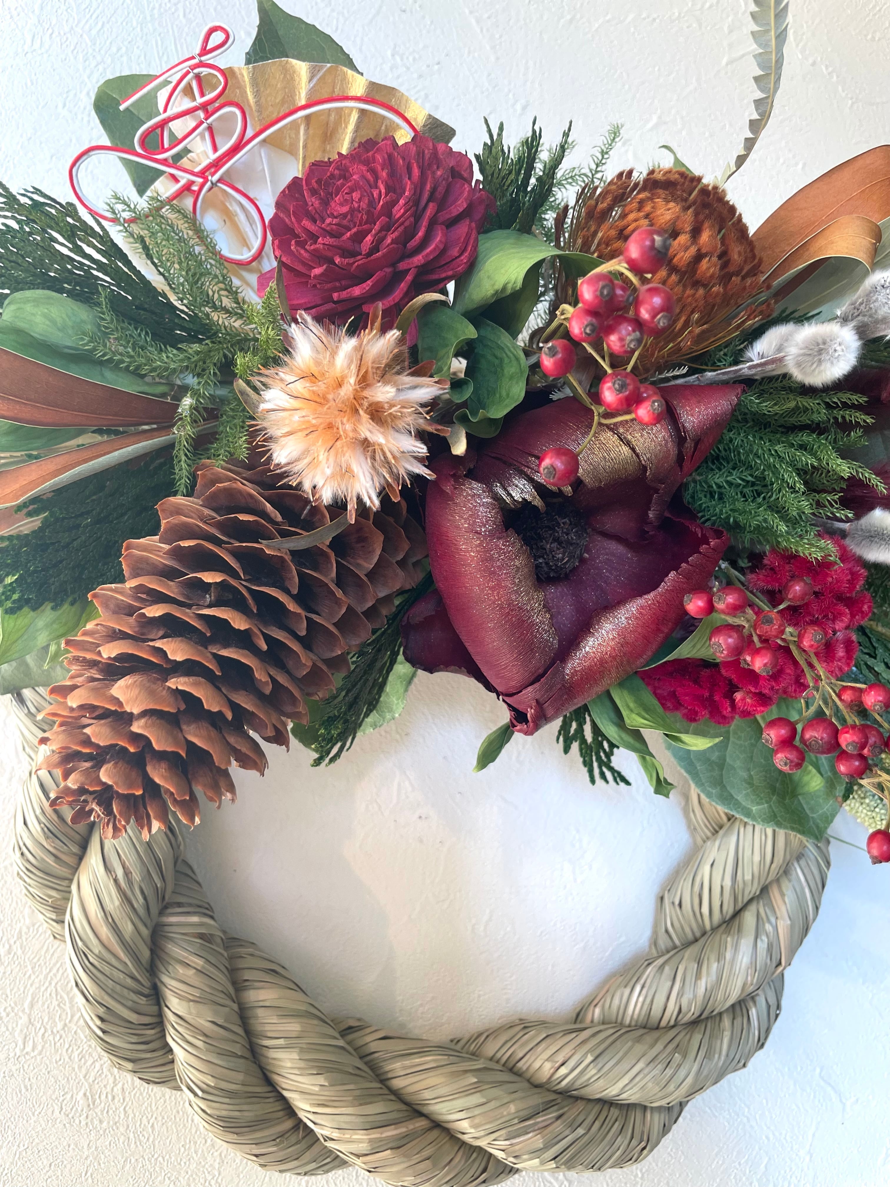 定番の毎年人気のデザインのしめ飾り。ゴールドの葉の色も美しく、華やかな花合わせのしめ飾り。玄関に飾って、素敵な1年を迎えましょう。