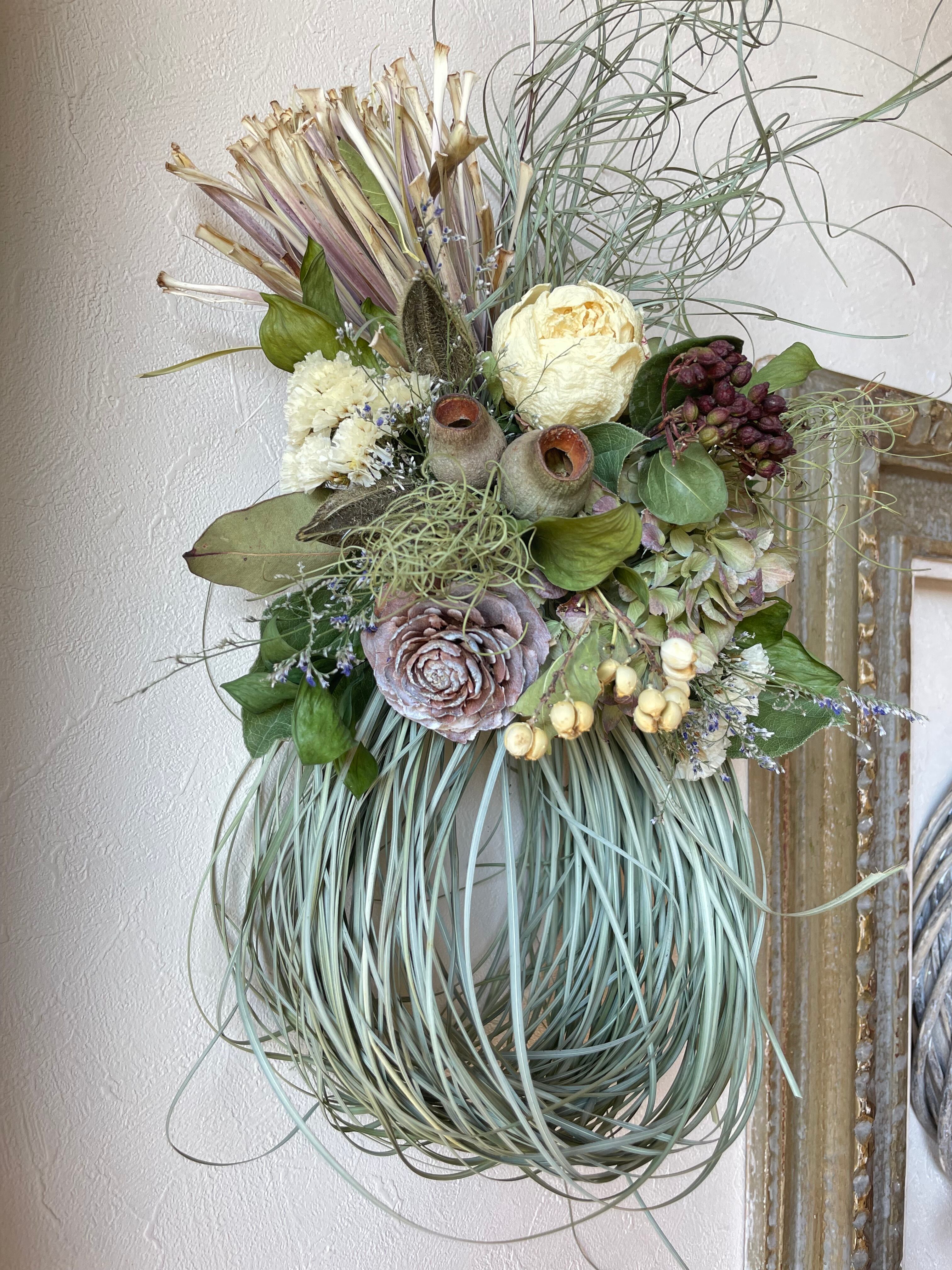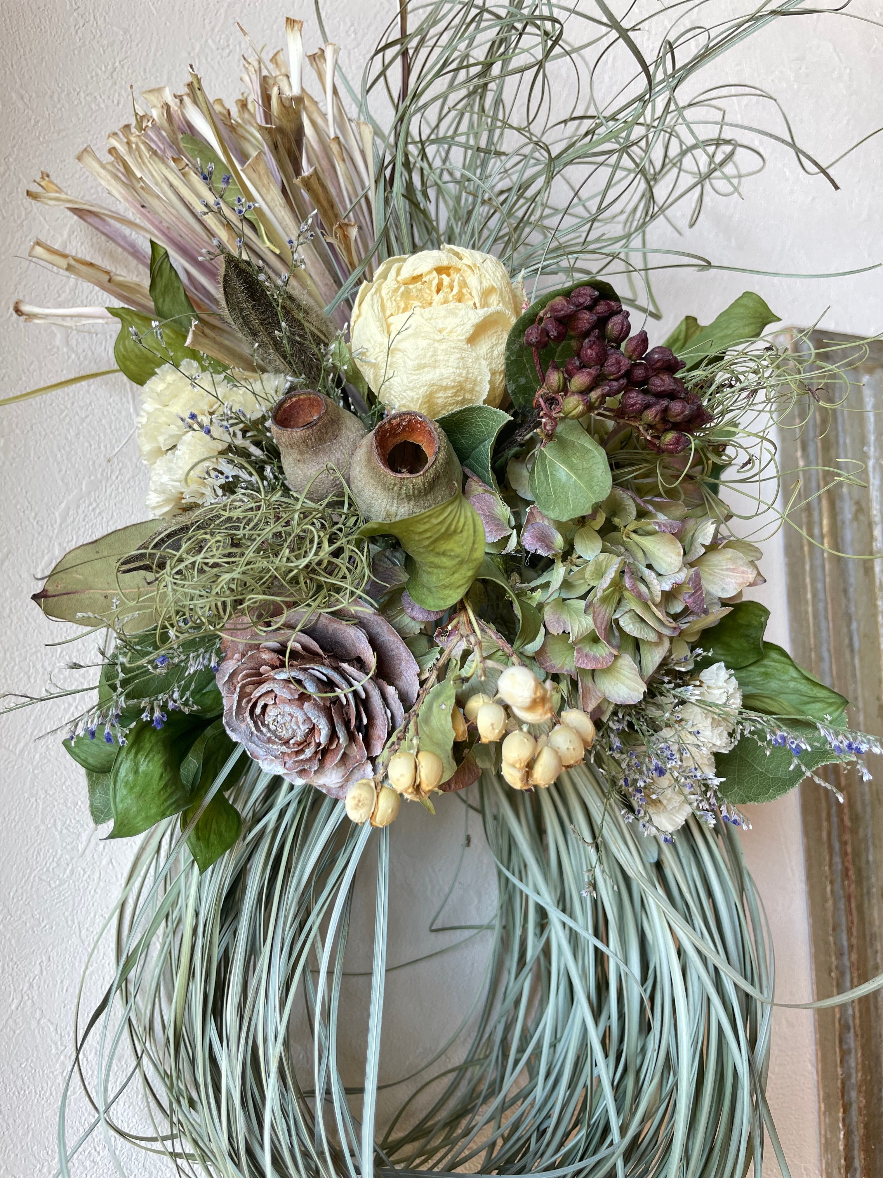 ベアグラスでベースを作ったリース。クルクルとした葉先も可愛く、また、横から見たときのベースのぽってり感がとてもかわいいです。